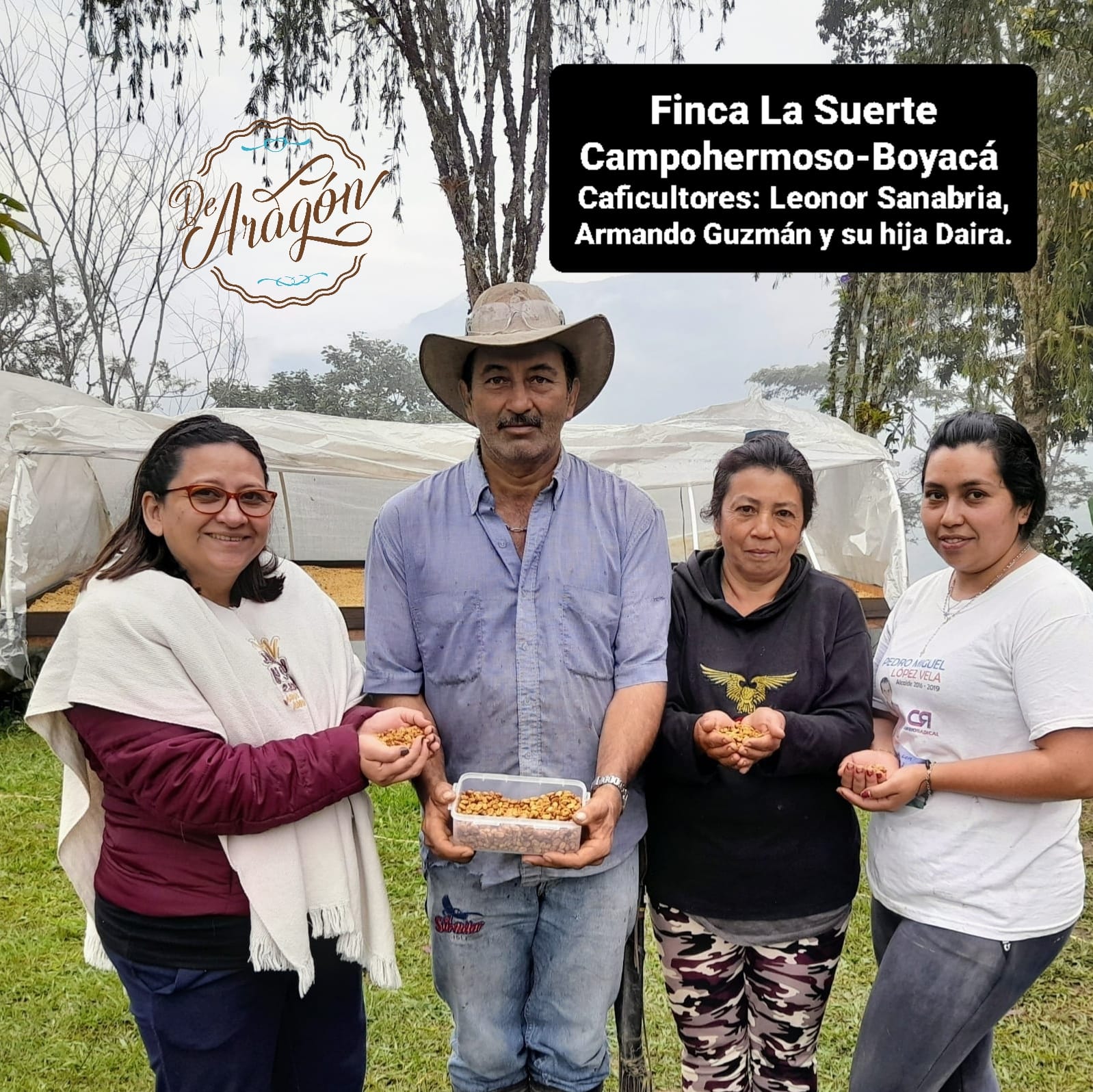 En la vereda Toldo Arriba, Don Armando Guzmán y Doña Leonor Sanabria cuidan un jardín de café compuesto por variedades Tabi, Típica, Castillo, Cenicafé, Borbón rojo, Borbón amarillo y Caturra. Desde el año 2019 son aliados con De Aragón aplicando técnicas de procesamiento para producir cafés lavados y honey (enmielado).